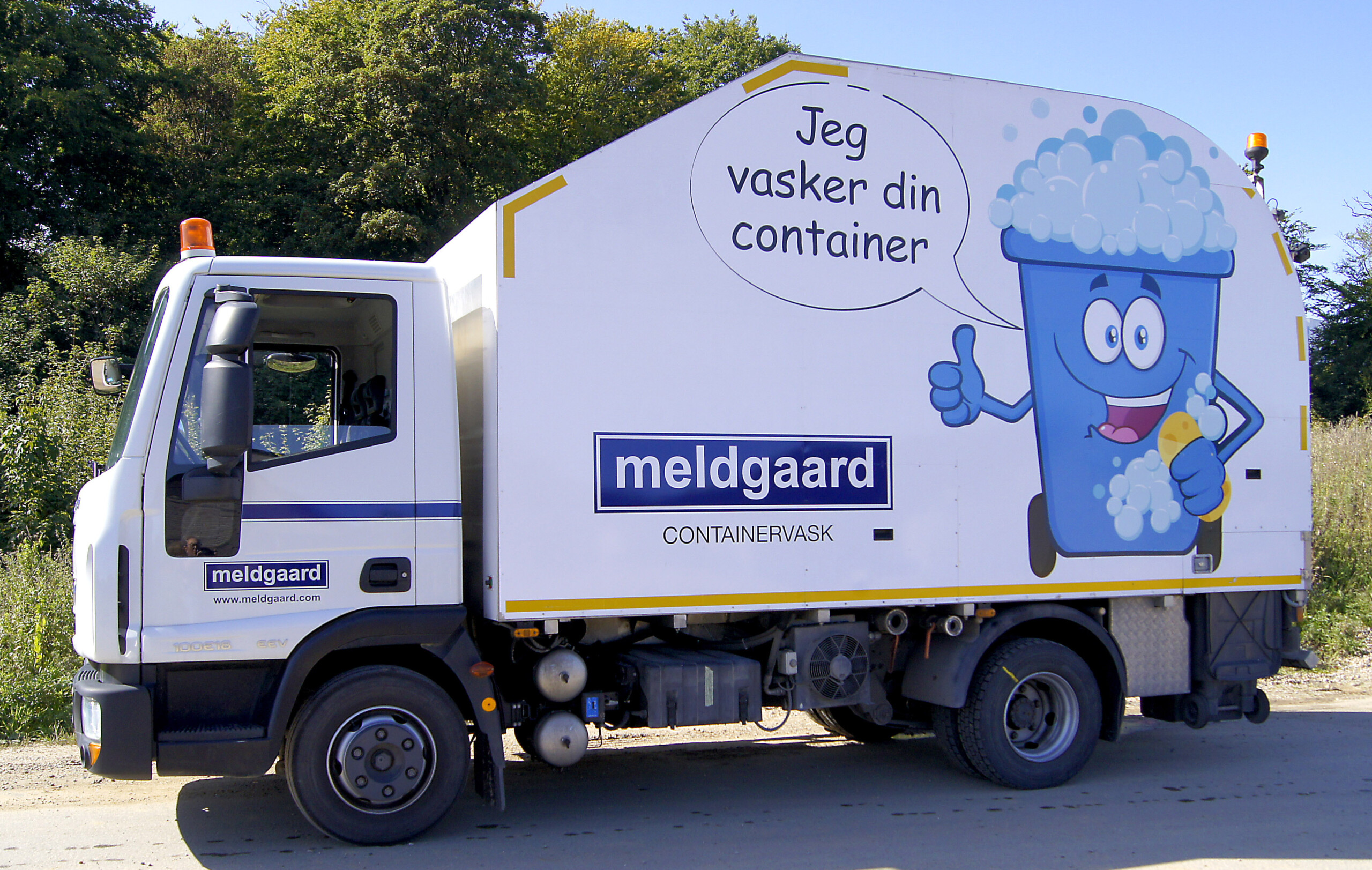 Meldgaards rullende vaskestation kører lige til døren. Den mobile vaskebil rykker ud til containeren, hvor vi vasker og fjerner snavs indvendig i spanden.